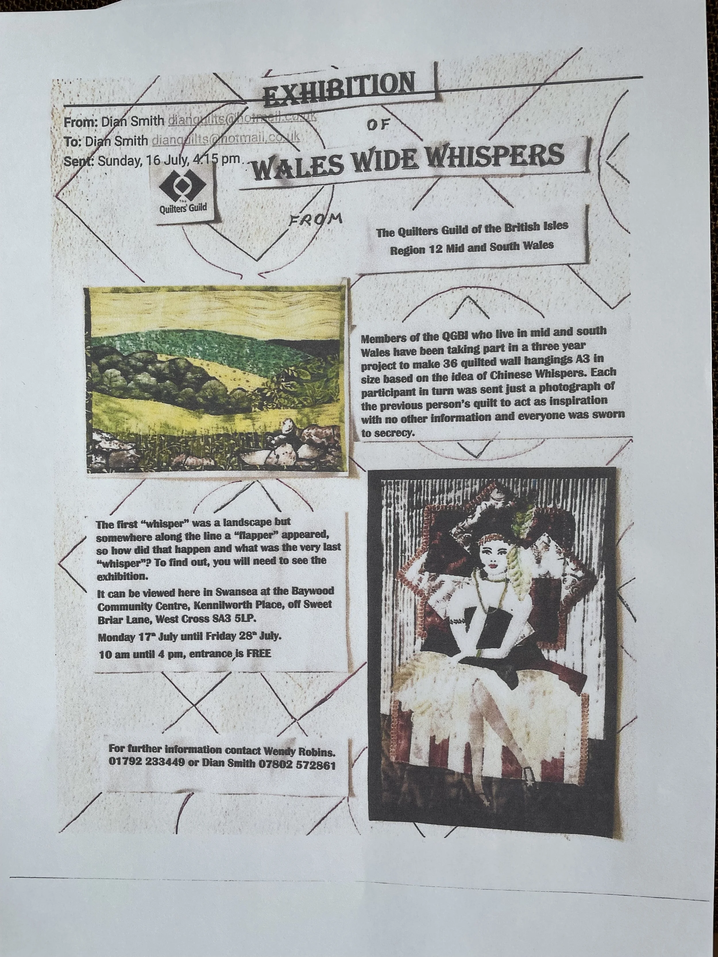 Hello and happy Friday! It’s been a busy week at Sister Makes. We’ve been working on commissions and Claire is working on something new. More on that in our new newsletter out in August! We have also been stewarding at The Quilters Guild of the British Isles, Region 12 Mid & South Wales Quilt Exhibition called ‘Wales Wide Whispers’. It is being held at the Baywood Community Centre, West Cross, Swansea and is on for one more week 10am-4pm. Entry and parking are free. It is a lovely way to pass some time especially if you are dodging the showers!